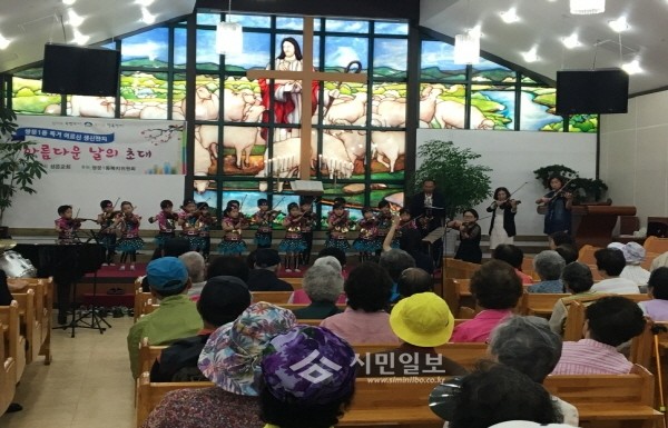 최근 도봉구 쌍문1동의 민간복지거점기관인 성은교회에서 2016년 1·2분기 ‘홀로 계신 어르신들을 위한 아름다운 날의 초대’ 생신잔치가 개최됐다. 사진은 어린이들이 바이올린 공연을 펼치고 있는 모습.(사진제공=도봉구청)