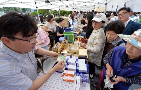 지난 20일 동대문구 소재 동아쏘시오그룹이 오전 9시30분 용신동 동아제약 본사 신관에서 '사랑나눔 바자회'를 개최했다. 사진은 바자회에 참석한 지역 주민들이 사랑나눔 제품을 구매하는 모습.(사진제공=동대문구청)