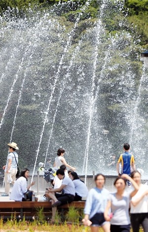 서울 낮기온이 33도까지 오른 22일 서울 능동 어린이대공원 음악분수대 앞에서 시민들이 휴식을 취하고 있다.