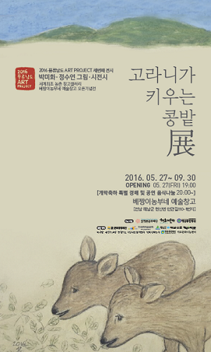 행촌문화재단은 2016 풍류남도 아트프로젝트의 세 번째 전시회‘고라니가 키우는 콩밭展’을 오는 27일부터 9월 30일까지 해남군 현산면 베짱이농부네 예술창고에서 개최한다.