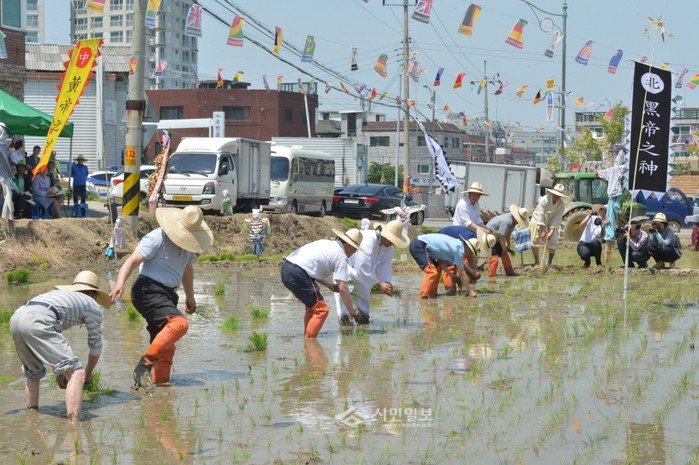 최근 경기 동두천지는 경기도 무형문화제 제55호 지정단체인 '동두천민요보존회' 주최로 지행동 사당골앞 농경지에서 모내기 체험, 민요공연 등을 실시하는 '권농일 행사'를 개최했다. 사진은 행사 참가자들이 직접 모를 심는 체험을 하고 있는 모습.(사진제공=동두천시청)