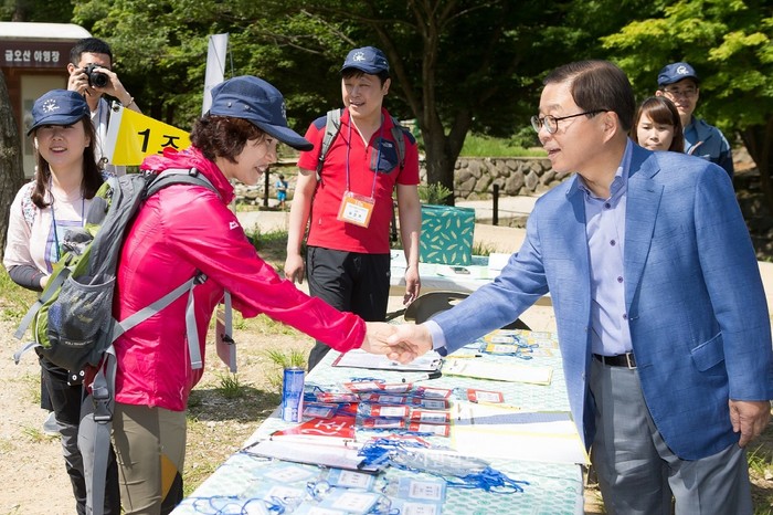 지난 21일 경북 구미시 금오산 일원에서 구미·김천·칠곡 등 중부지역 소상공인 200여명이 참석한 가운데, 소상공인들의 경쟁력 강화를 위한 '경북중부지역상생네트워크 행사'가 개최됐다. 사진은 남유진 시장(오른쪽)과 참가자가 악수하는 모습.(사진제공=구미시청)
