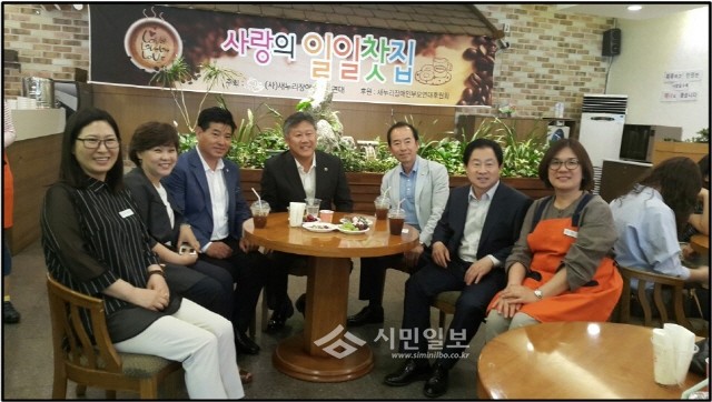 | ▲ '사랑의 일일찻집'에서 송낙영 경기도의원(가운데)이 참여자들과 기념촬영을 하고 있다. | ||