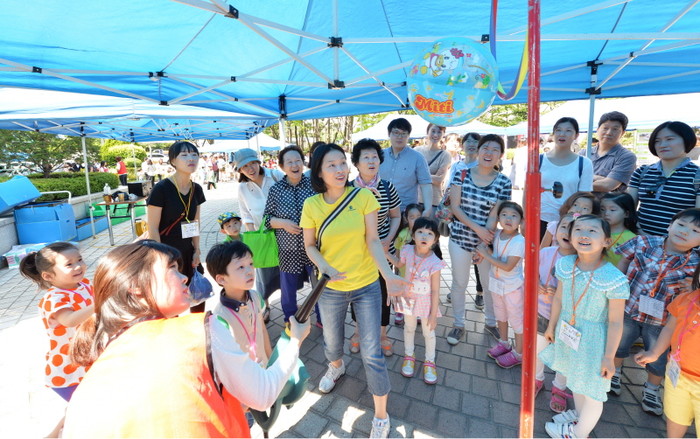 지난 21일 서울 동대문구가 구청 정문 광장과 2층 강당에서 유치원 어린이들의 상상력 증진과 창의력 발달을 위한 과학체험캠프를 개최했다. 사진은 과학캠프에 참가한 어린이들이 체험활동을 하고 있는 모습.(사진제공=동대문구청)