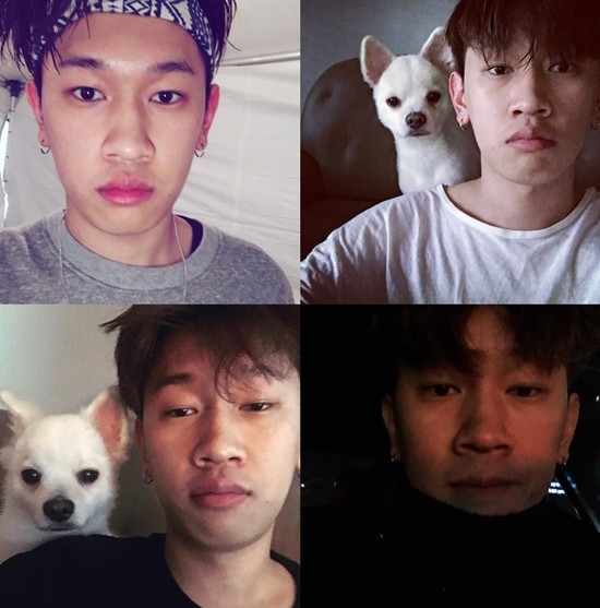 사진 속 크러쉬는 무표정을 지어 카메라를 응시하고 있다. 강아지 또한 그와 함께 멍한 표정을 짓고 있어 보는 이들의 시선을 사로잡았다.