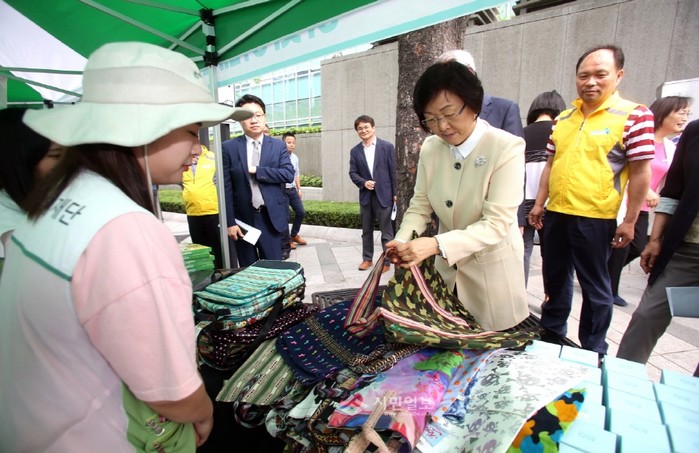신연희 강남구청장이 지난 23일 오전 11시 서울 강남구 테헤란로 이면 도로에서 열린 ‘저소득 장애 아동 돕기 나눔 바자회’를 방문해 판매 제품을 둘러보고 있다.(사진제공=강남구청)