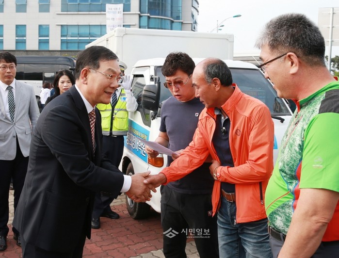 지난 23일 장만채 전남도교육감은 오전 7시 목포애향중학교를 방문, 안전한 수학여행 추진상황을 점검하고 학생, 인솔교사, 운송업체를 격려했다. 사진은 장 교육감(왼쪽)이 관계자들과 악수하는 모습.(사진제공=전남도교육청)