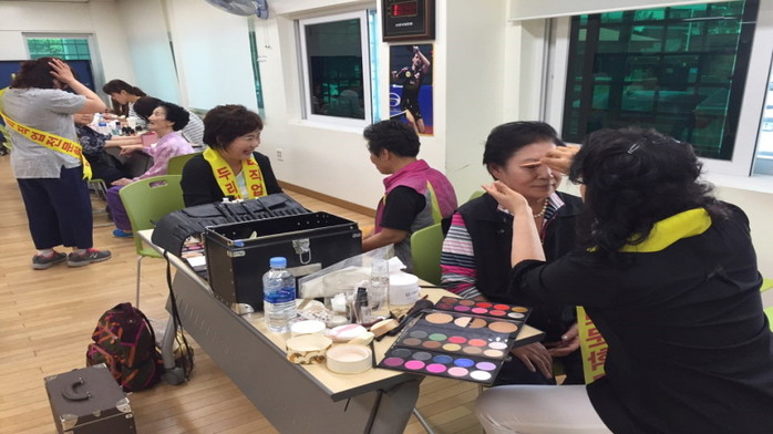 최근 경기 오산시 중앙동주민센터는 다목적실에서 두리직업전문학교와 협력해 지역내 저소득 노인 30여명을 대상으로 이·미용봉사 및 장수사진 찍어주기 봉사활동을 실시했다. 사진은 자원봉사자들이 노인들에게 화장을 해 주고 있는 모습.(사진제공=오산시청)