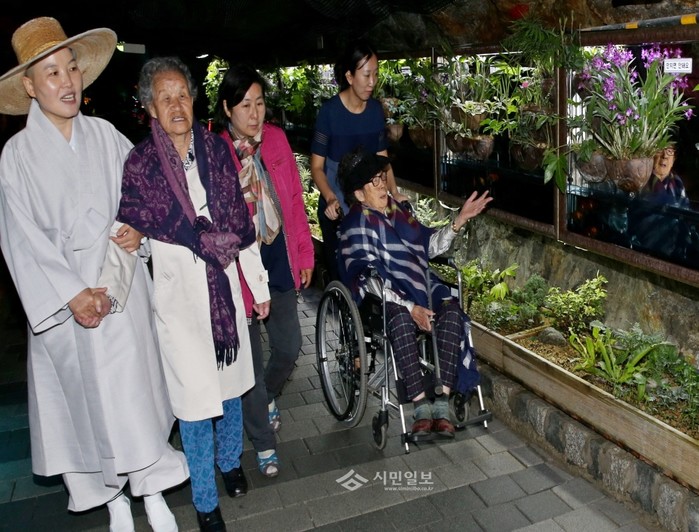 지난 23일 양기대 광명시장이 경기도 '광주 나눔의 집'에서 생활하는 일본군 위안부 피해 할머니 두명을 광명동굴로 초청했다. 사진은 할머니들이 이날 같이 방문한 관계자들과 동굴을 구경하는 모습.(사진제공-광명시청)