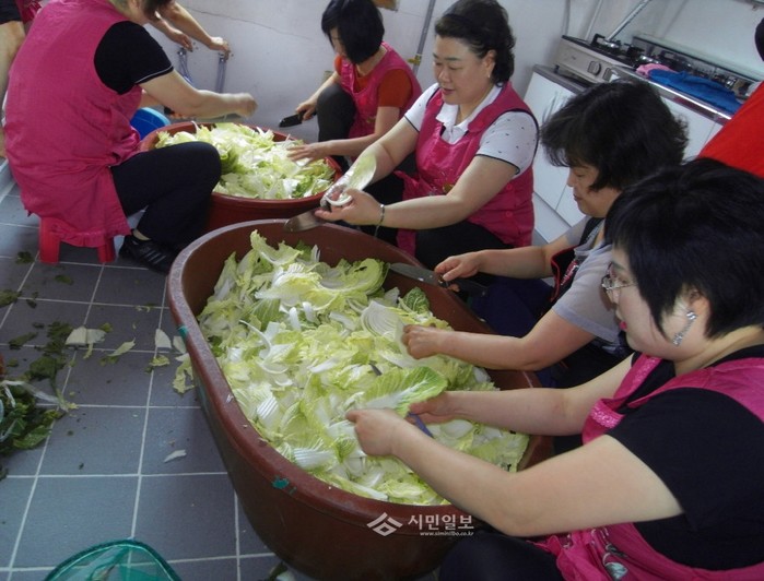 지난 23일 경기 수원시 팔달구 여성자원봉사회는 팔달 반찬나눔 센터에서 회원 15명이 모여 ‘사랑의 반찬나눔’ 행사를 실시했다. 사진은 행사에 참석한 관계자들이 배추를 다듬는 모습.(사진제공=팔달구청)