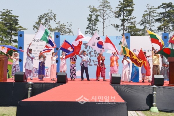 지난 22일 경기 김포시는 제9회 세계인의 날을 기념해 걸포중앙공원에서 외국인주민 및 시민 등 4000여명이 참여한 가운데 ‘김포 세계인 큰잔치’를 성황리에 개최했다. 사진은 행사에 참석한 유영록 시장(가운데)이 단상에서 태극기를 흔드는 모습.(사진제공=김포시청)