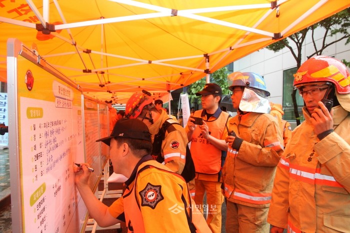 지난 24일 서울 동작소방서는 신대방동 소재 남부수도사업소에서 재난대비 불시 긴급구조통제단 가동훈련 평가를 실시했다. 사진은 훈련 중에 소방서 관계자들이 재난발생 현황에 대해 확인하는 모습.(사진제공=동작소방서)