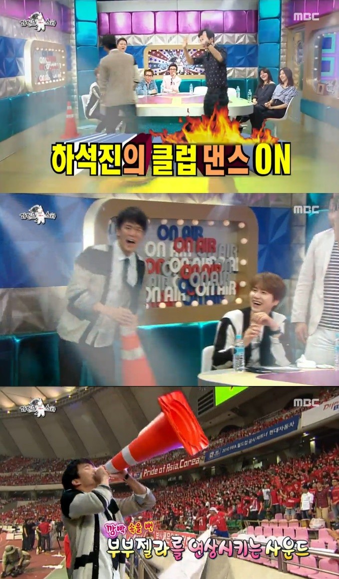 실제 김지석과 춤을 추는 상황에서도 미리 준비된 삼각뿔을 마치 부부젤라처럼 불어 모두를 폭소케 만들었다.