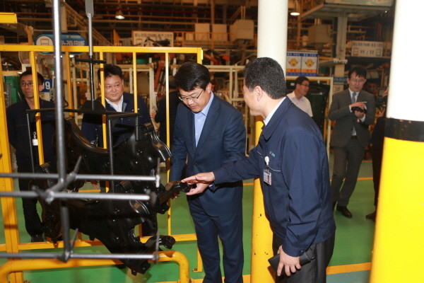 지난 25일 복기왕 충남 아산시장은 선장면에 위치해 있는 (주)동희를 방문해 기업경영 애로사항을 청취하고 생산현장을 돌아보며 임직원과 소통하는 기업 현장방문을 실시했다. 사진은 복 시장(가운데)이 기업 시설물을 살펴보는 모습.(사진제공=아산시청)