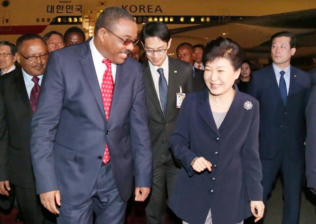아프리카 3개국 및 프랑스 국빈방문에 나선 박근혜 대통령이 25일 오후(현지시각) 첫 순방국인 에티오피아 아디스아바바 볼레 국제공항에 도착, 환영 나온 하일레마리암 데살렌 총리(왼쪽)와 대화를 하며 이동하고 있다.