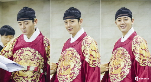 공개된 사진 속 이지훈은 붉은 곤룡포를 차려 입고 늠름한 자태를 과시하고 있다. 이지훈은 의상 점검 중에도 대본에서 손을 놓지 않는 진중한 모습에서 작품에 대한 남다른 열의가 느껴진다. 또한 카메라를 향해 그윽한 눈빛과 해맑은 미소는 보는 이들의 마음을 훈훈하게 한다.