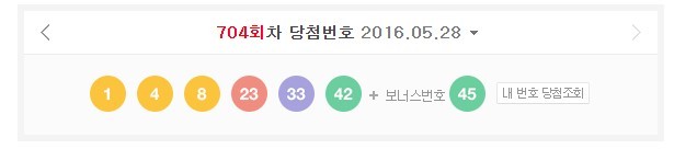 한편 로또 704회 당첨번호는 '1, 4, 8, 23, 33, 42’이며 보너스 번호는 '45'이다.