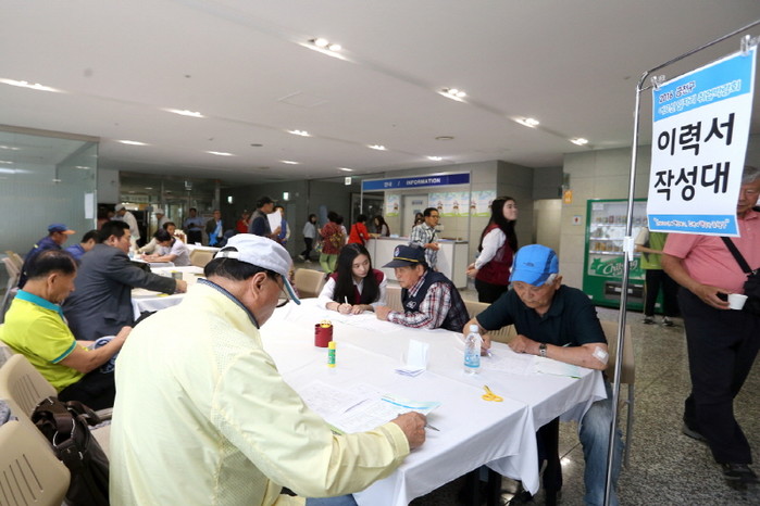 지난 26일 서울 금천구는 오후 1~5시 구청 대강당에서 '어르신일자리 취업박람회'를 개최했다. 사진은 취업박람회에 참석한 장·노년층 주민들이 이력서를 작성하는 모습.(사진제공=금천구청)