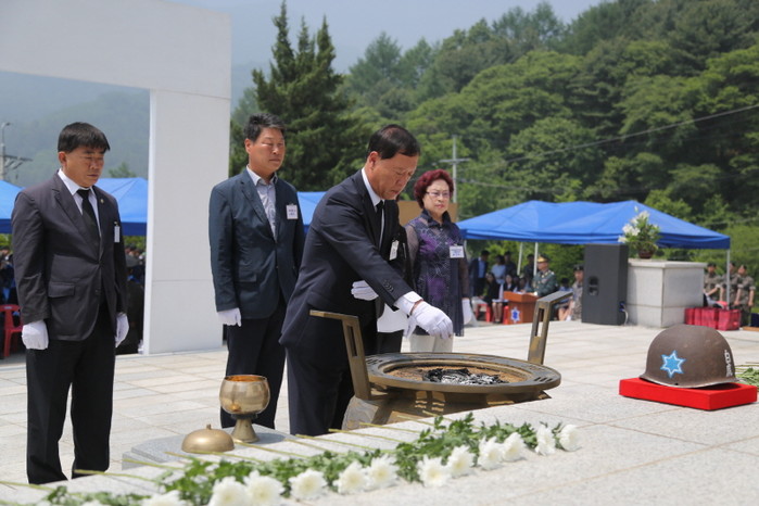 지난 27일 경기 가평군은 설악면 천안리 용문산 전투 전적비 경내에서 제65주년 용문산 대첩 전승 기념식을 개최했다. 사진은 김성기 군수(가운데)가 기념식에서 헌화 및 분향을 하는 모습.(사진제공=가평군청)