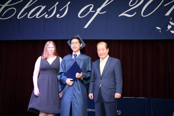 지난 27일 박홍섭 마포구청장이 상암동에 위치한 '서울 드와이트 외국인학교'의 졸업식에 참석했다. 사진은 박 구청장(오른쪽)이 졸업생에게 '다국어능통상'을 표창한 후 기념촬영하고 있는 모습.(사진제공=마포구청)