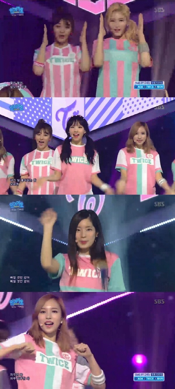 트와이스는 29일 방송된 SBS '인기가요'에서 트와이스는 최근 대세곡 'Cheer Up'으로 무대에 올라 여고생 치어리더를 연상시키는 의상과 상큼발랄한 안무로 보는 이들의 마음을 흔들었다. 특히 '인기가요'의 MC인 BTOB 육성재와 스페셜 MC BTOB 이창섭, 오마이걸 유아가 'Cheer Up' 안무에 동참하며 눈길을 끌기도 했다.