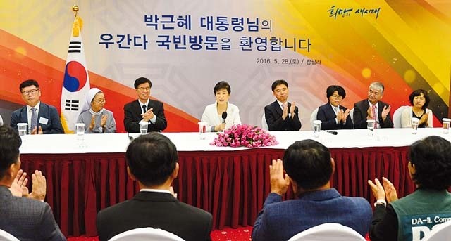 박근혜 대통령이 28일 오후(현지시간) 아프리카 순방 두 번째 나라인 우간다에 도착, 수도 캄팔라에서 열린 동포간담회에서 인사말을 하고 있다. 박 대통령은 이날 무세베니 대통령과 정상회담을 열어 양국 간 개발 협력 사업 등에 대해 집중 논의했다.
