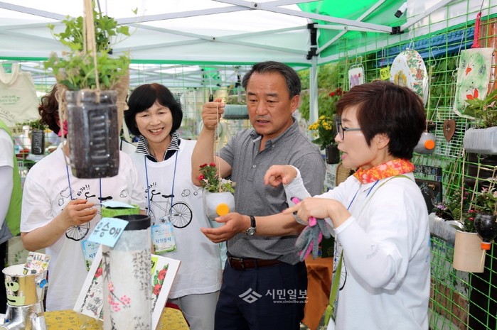 지난 28일 경기 안성시는 '제21회 환경의 날'을 맞아 '환경의날 기념식 및 제9회 산내들 푸른안성 환경축제'를 안성 금석천변에서 성황리에 개최했다. 사진은 황은성 시장(오른쪽에서 두 번째)이 환경체험 부스에서 식물들을 살펴보는 모습.(사진제공=안성시청)