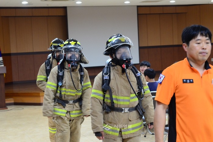 최근 영등포소방서는 여의도중학교 학생들을 대상으로 '소방관 직업체험 교실'을 운영했다. 사진은 프로그램에 참가한 학생들이 소방관들이 입는 특수방화복과 보호장비를 착용하고 걷고 있는 모습.(사진제공=영등포소방서)