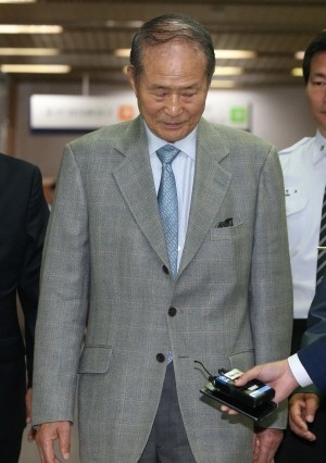이상득 전 의원이 30일 오전 서울 서초구 서울중앙지법에서 포스코 비리 연루 첫 공판기일에 출석하기 위해 법정으로 향하고 있다.
