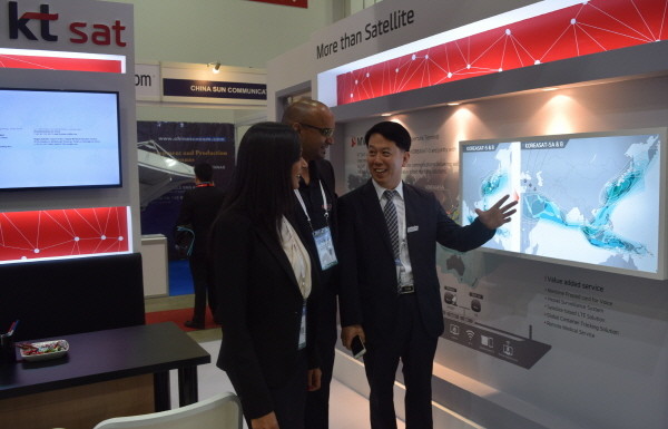 KT SAT 글로벌사업1팀 염병국 팀장이 KT SAT 부스를 방문한 해외 업체 관계자들과 대화를 나누고 있다.