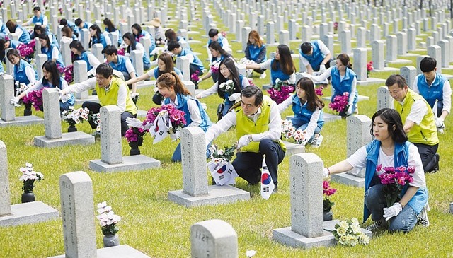NH영서포터즈 대학생들과 농협임직원들이 6월 호국보훈의 달을 앞둔 31일 서울 동작구 국립서울현충원에서 헌화 및 묘역 정화활동을 하고 있다.