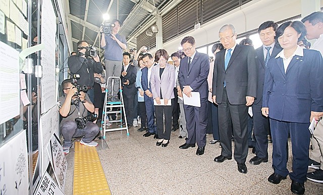 더불어민주당 김종인 비상대책위 대표와 을지로위원회 의원들이 31일 오후 서울 광진구 구의역을 방문, 스크린도어 정비 작업중 숨진 김모(19) 씨의 사고 현장을 둘러보고 있다.
