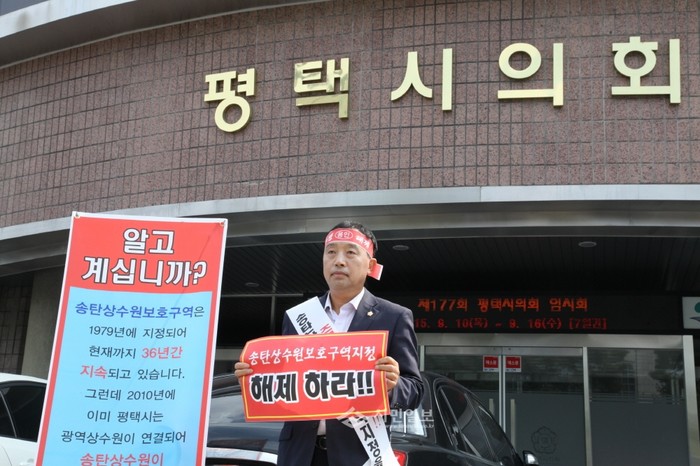 | ▲ 송탄상수원보호구역 해제 촉구를 위해 평택시의회 앞에서 1인 시위를 하고 있는 신 의장. | ||