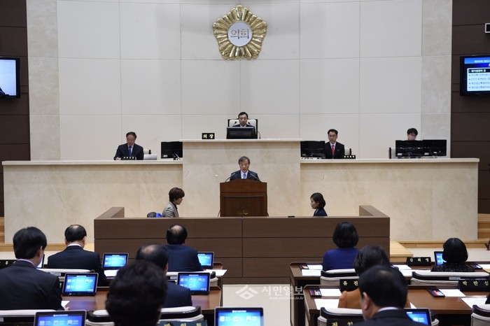 | ▲ 시민이 주도적인 역할을 하는 자율형 정책 등 올해의 시의회운영 방침에 대해 설명하고 있는 신현수 의장. | ||