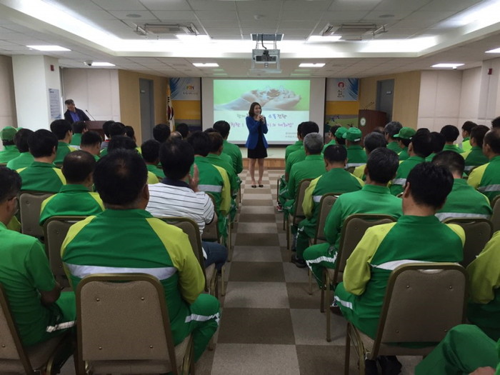 최근 경기 수원시 팔달구는 환경관리원을 대상으로 누수없는 청소행정 추진과 즐거운 직장생활을 위한 직장교육을 실시했다. 사진은 한국CS아카데미 김윤경 강사가 환경관리원들에게 강의하는 모습.(사진제공=팔달구청)