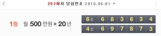 한편 연금복권 257회차 1등 당첨번호는 등 당첨번4조 697873번과 6조 683634번이 뽑혔다.