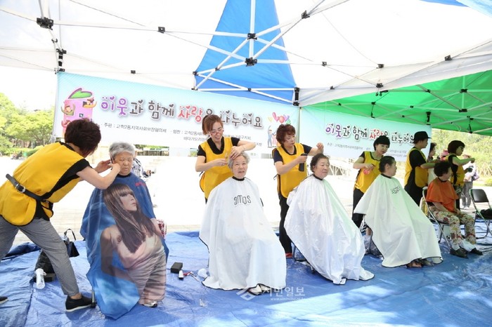 지난달 31일 구로구 고척근린공원에서 고척2동 지역사회보장협의회가 주관하고 (사)대한미용사회 구로구지회 천사봉사단이 후원해 홀몸·저소득 노인 150여명을 대상으로 '이·미용 봉사활동'이 펼쳐졌다. 사진은 행사 참가자들이 노인들의 머리를 손질하는 모습.(사진제공=구로구청)