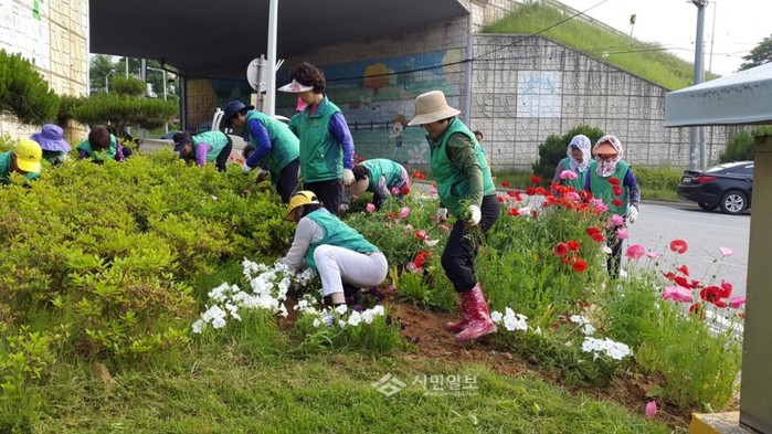 최근 경기 양평군 용문면 새마을협의회는 40여명의 회원이 참여한 가운데 갈월·마룡IC 환경정비와 함께 화전리 해바라기밭 제초작업 등의 환경개선 활동을 실시했다. 사진은 회원들이 도로변 화단 환경정비를 하고 있는 모습.(사진제공=양평군청)