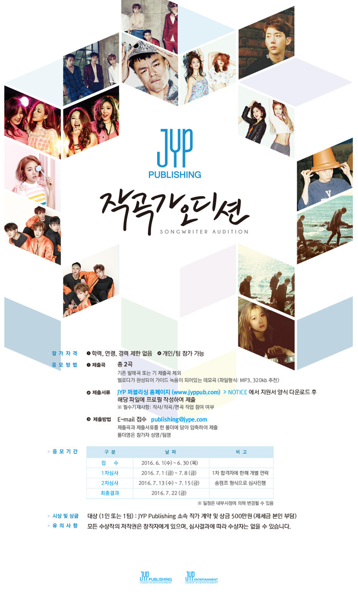 접수 시 작가, 작곡, 편곡 작업 참여 여부를 필수로 기재하여야 하고 지원 양식은 JYP 공식 홈페이지 공지사항에서 찾아볼 수 있다.
