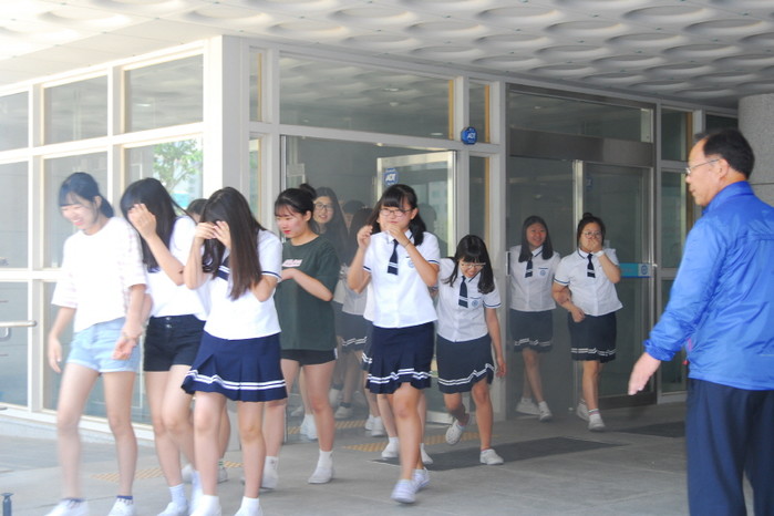 2일 경기 하남소방서는 미사강변중학교 전교생 및 교직원을 대상으로 공공기관 합동소방훈련을 실시했다. 사진은 훈련에 참가한 학생들이 화재발생시 연기 대피 체험을 하는 모습.(사진제공=하남소방서)