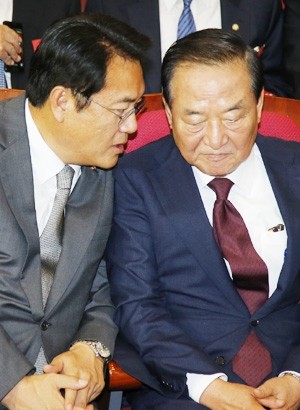 새누리당 정진석 원내대표와 서청원 전 최고의원이 2일 오후 국회에서 열린 제4차 전국위원회에서 만나 대화하고 있다.