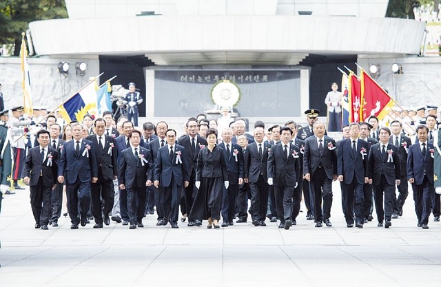 박근혜 대통령이 6일 오전 서울 동작구 국립서울현충원에서 열린 제61회 현충일 추념식에서 헌화 및 분향 후 자리로 돌아가고 있다.