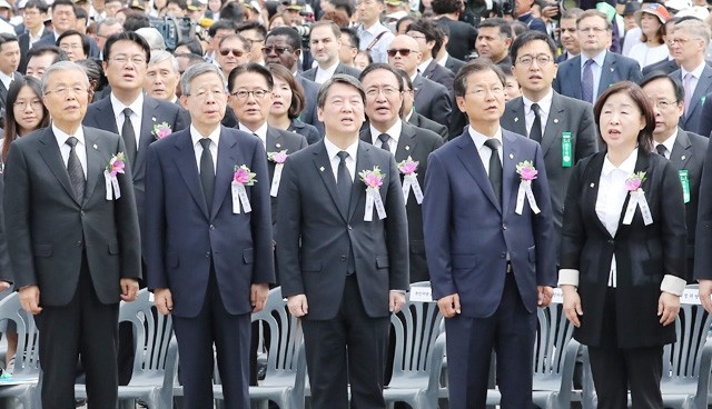 더불어민주당 김종인 비상대책위원회 대표(왼쪽부터), 새누리당 김희옥 혁신비상대책위원장, 국민의당 안철수·천정배 공동대표, 정의당 심상정 상임대표가 6일 오전 서울 동작구 동작동 국립서울현충원에서 열린 제61회 현충일 추념식에서 애국가를 부르고 있다.