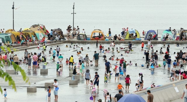 현충일이자 연휴 마지막 날인 6일 오후 서울 여의도 한강변에 있는 물빛광장은 더위를 식히는 시민으로 북적거리고 있다.