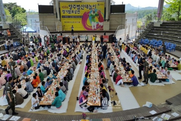 최근 경기 양주시 양주1동 주민자치위원회는 양주별산대 놀이마당 대공연장에서 양주1동 노인들을 초대해 사한국무용, 초청가수 공연과 오찬 등 ‘제7회 양주1동 경로잔치’를 개최했다. 사진은 행사에 참석한 노인들이 식사하는 모습.(사진제공=양주시청)