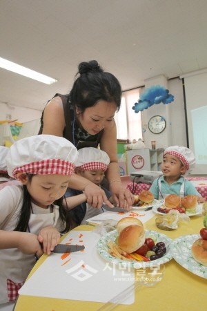 최근 송파구가 어린이들이 체험을 통해 올바른 식습관을 형성할 수 있도록 하기 위한 ‘영어쿠킹클래스’를 운영했다. 사진은 무궁화어린이집 원아들이 원어민선생님과 함께 야채와 과일을 썰어 샐러드를 만들고 있다.(사진제공=송파구청)