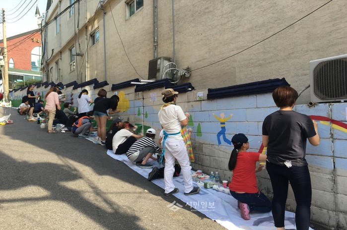 최근 서울 성동구 금호2·3가동 주민자치위원회가 금남시장 주변 환경개선을 위해 실시한 ‘금호동 벽화마을 만들기’ 프로젝트 참가자들이 시장 일대 약 150㎡ 구간 담벼락에 산과 들, 꽃과 나무가 어우러진 그림을 그리고 있다.(사진제공=성동구청)