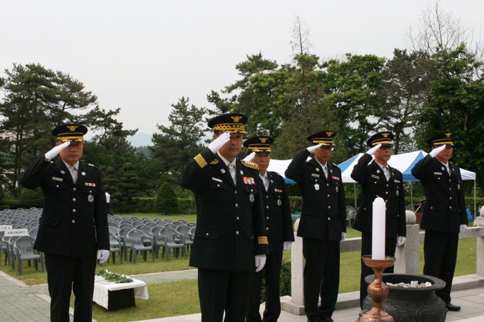 지난 6일 경기 연천소방서는 연천군 연천읍 차탄리에 위치한 현충탑에서 헌화 및 참배행사를 실시했다. 사진은 이경호 서장(맨 앞)을 비롯한 소방서 관계자들이 순국선열 및 호국영령에 대한 경례를 하는 모습.(사진제공=연천소방서)