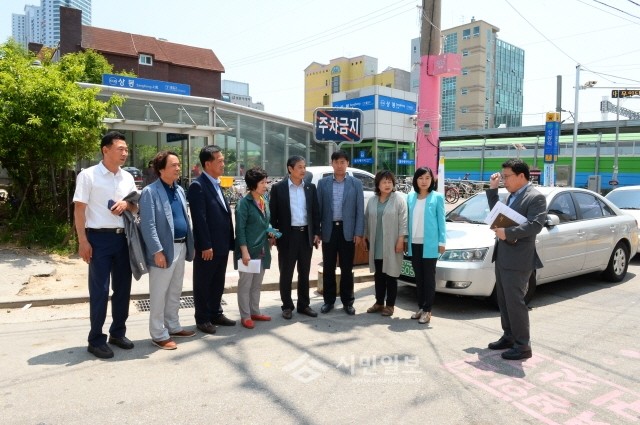 최근 서울 중랑구의회 복지건설위원회 위원들은 상봉역을 방문해 '상봉1동 안심체 안전마을 만들기' 조성현장을 점검했다. 사진은 의원들이 관계자에게 사업 설명을 듣는 모습.(사진제공=중랑구의회)