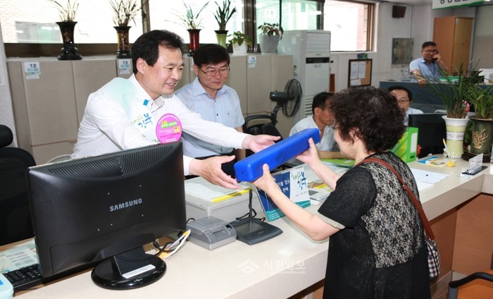 지난 7일 박겸수 강북구청장이 삼양동 주민센터에서 일일동장으로 활동하며 동주민센터를 방문한 주민에게 태극기를 전달하고 있다. 박 구청장은 오는 10월6일까지 13개동 주민센터를 방문해 일일동장이 돼 주민들과 만날 예정이다. (사진제공=강북구청)